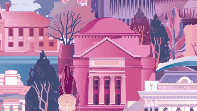 内页左侧为精美的插图页,以清华校色紫色为主色调,运用装饰艺术的视觉表现风格,提取校河、荷塘、荷花等清华元素,与清华学堂、二校门、大礼堂、日晷、西体育馆等系列标志性建筑相融合,展现了清华校园深厚的人文底蕴和生机活力。