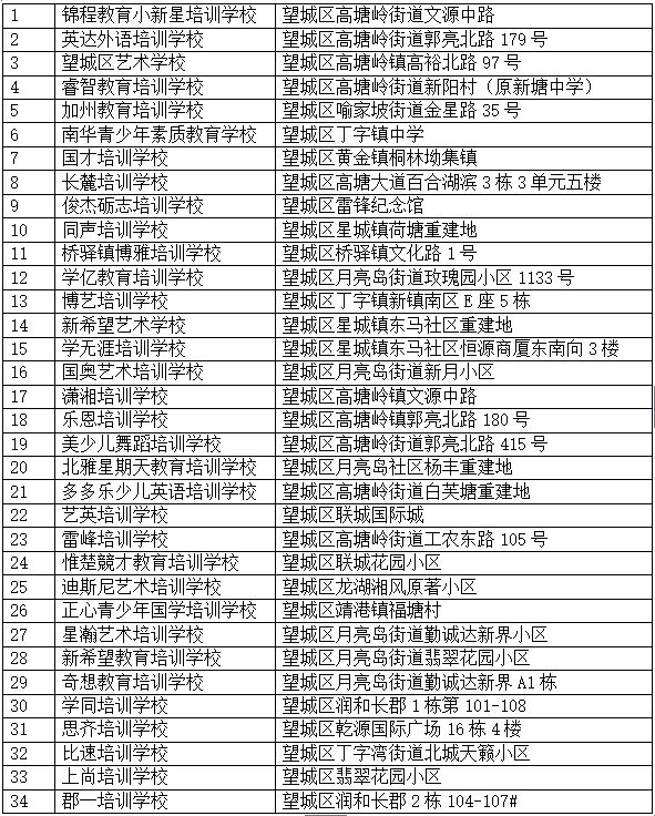 为认真贯彻落实教育部办公厅等四部门《关于切实减轻中小学生课外负担开展校外培训机构专项治理行动的通知》(基教厅〔2018〕3号)、省教育厅等四部门印发的《湖南省校外培训机构专项治理工作方案》(湘教发〔2018〕8号)和《长沙市无证办学和违规办学专项治理工作方案》(长清办发〔2018〕1号)精神,积极引导社会公众关注教育培训,进一步规范校外培训市场,治理校外培训乱象,望城区教育局发布2018年全区34家合法民办培训学校和120家合法民办幼儿园名单,并印发《致全体家长的公开信》。