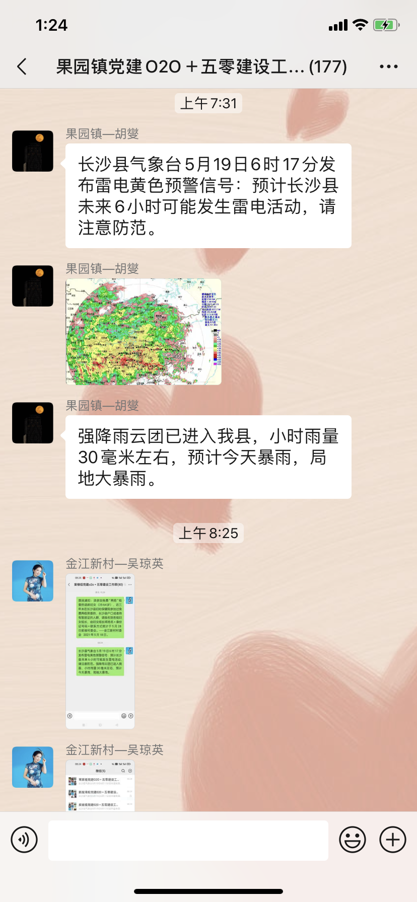 “今天有暴雨,请村社区应急专干迅速开展工作,巡查道路及时报送隐患。”早上七点三十分,果园镇应急办主任胡燮开始在信息沟通群发送预警信息,并进行应对极端天气的应急工作安排。