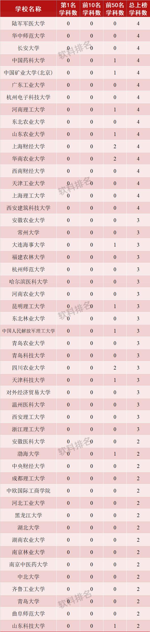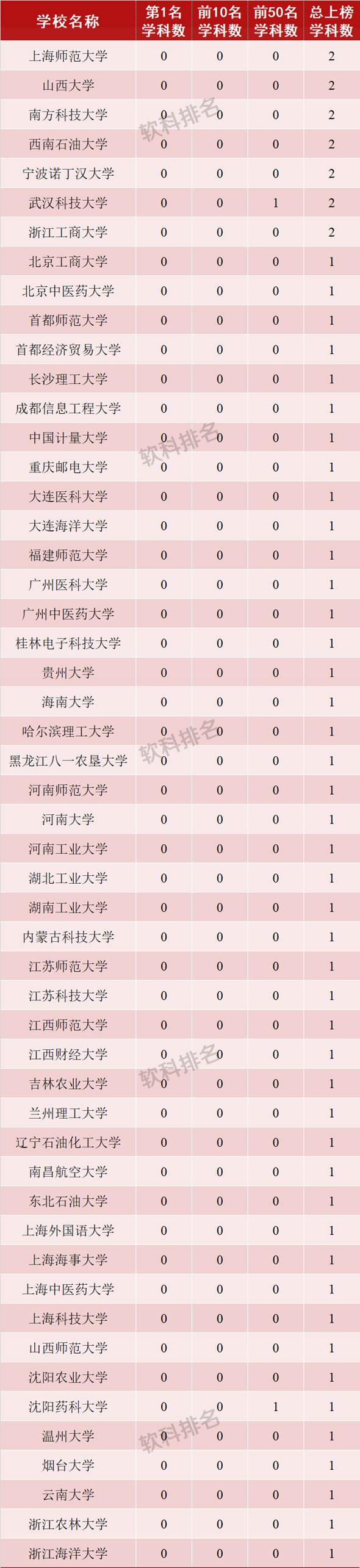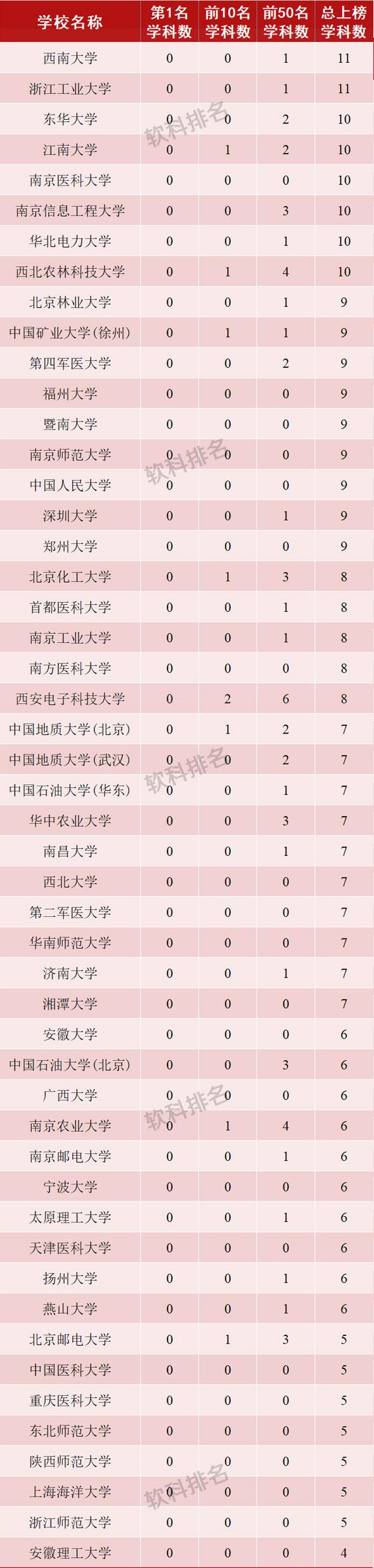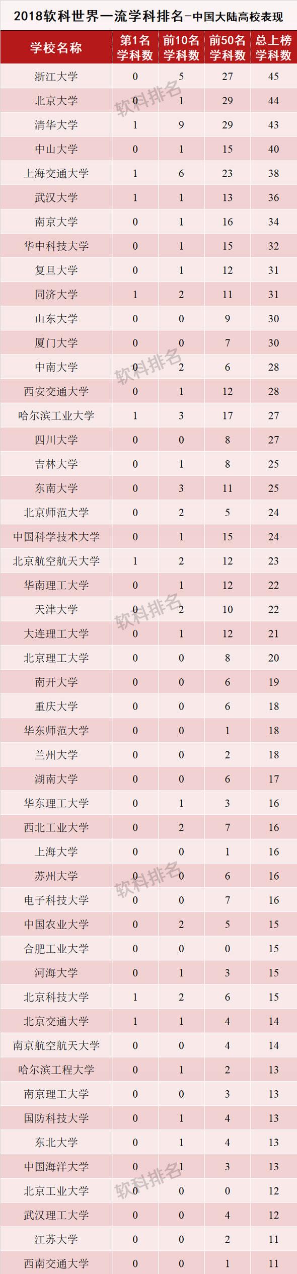 从各校上榜数量看,浙江大学成为今年上榜学科次数最多的高校,共计45个学科上榜。北京大学、清华大学、中山大学和上海交通大学分别以44次、43次、40次和38次上榜数,排在全国前五。之后,武汉大学、南京大学、华中科技大学、复旦大学、同济大学依次紧随其后。