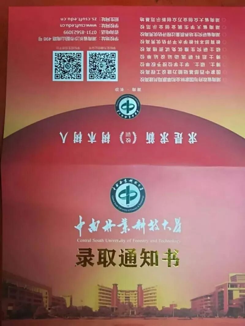 以红色为主基调,寓意喜庆与祝贺,金色的“录取通知书”字样寄予对金榜题名的中南林科大的准大一新生的热切期盼,同时表达积极的欢迎。