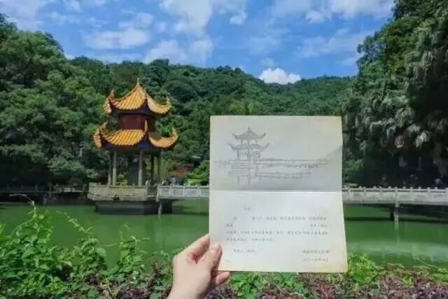 翻开通知书的瞬间,线绘的师大八景之一——岳王亭将会呈现在眼前。