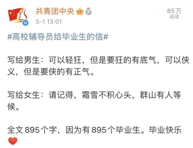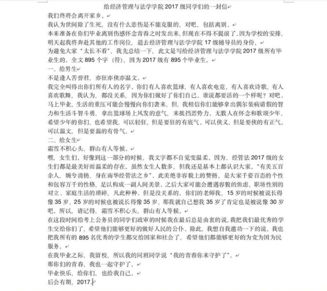 湖南一高校辅导员给毕业生的信火了,895个学生,895个字