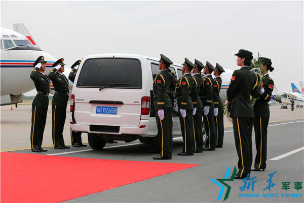 ↑6月9日下午,迎接烈士回国仪式现场,礼兵们敬礼,送别载着烈士灵柩的灵车。新华社记者曾涛摄