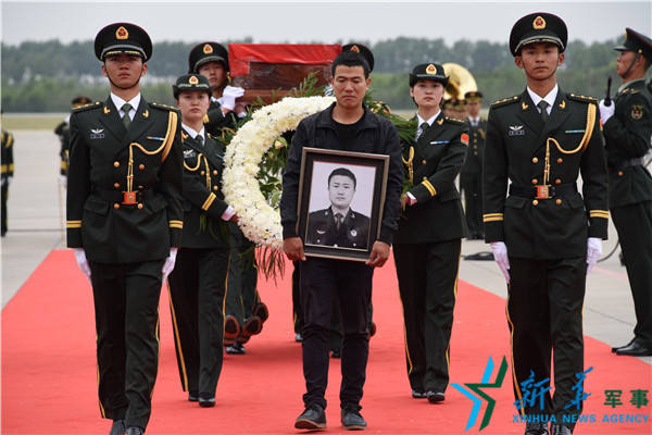 ↑6月9日下午申亮亮烈士的哥哥申明明手捧遗像,和礼兵一起,护送烈士灵柩上灵车。新华社记者曾涛摄