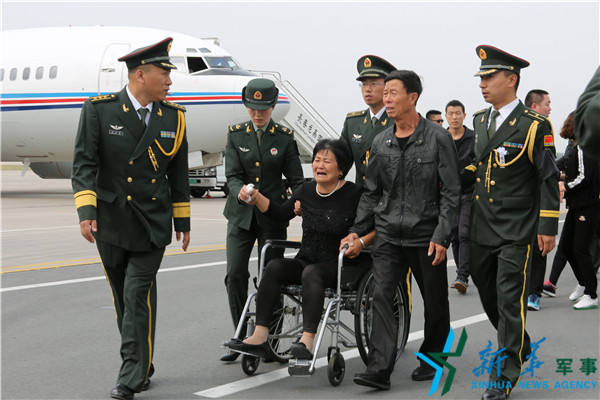 ↑6月9日下午,长春龙嘉机场,在迎接申亮亮烈士灵柩回国仪式前,烈士父亲申天国(右二)和母亲(坐轮椅者)杨秋花在工作人员陪同下入场。新华社记者曾涛摄