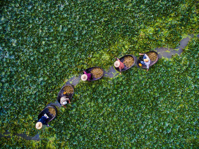 浙江省湖州市吴兴区东林镇的农民们划着木桶,采摘刚成熟的菱角(2016年10月9日摄)。新华社记者 徐昱 摄