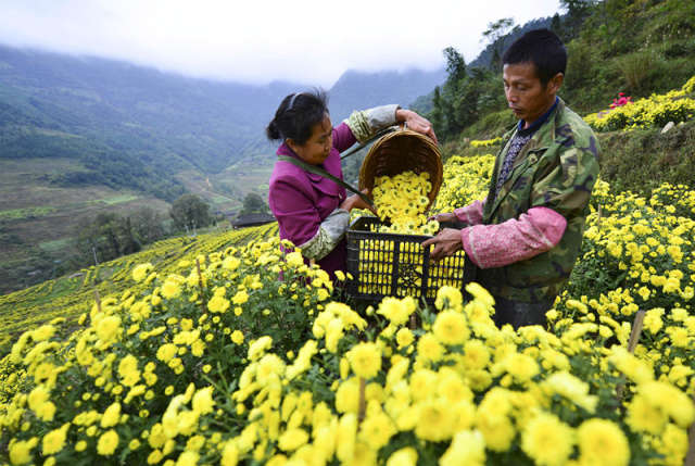 2016年11月2日,广西龙胜各族自治县泗水乡周家村白面瑶寨的花农在采摘皇菊。新华社发(潘志祥 摄)