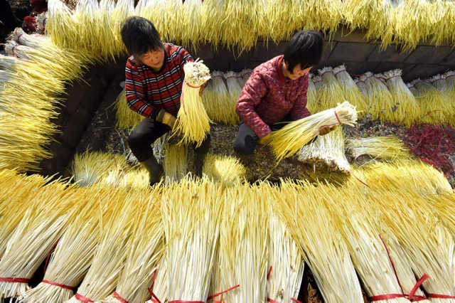 2016年12月1日,山东省沂源县悦庄镇东小水村的农民在整理收获的蒜黄。新华社发(赵东山 摄)