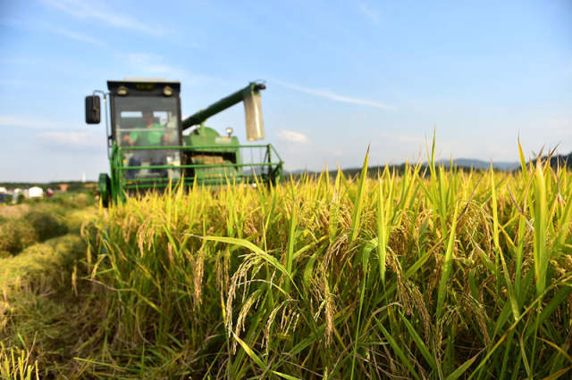 2016年9月20日,在安徽泾县晏公镇,农民驾机收割水稻。新华社记者 刘军喜 摄