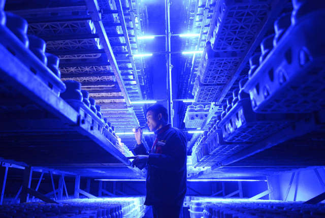 2016年12月2日,在山东邹城友和食用菌基地,一名技术人员在金针菇栽培室观察。新华社发(王齐胜 摄)