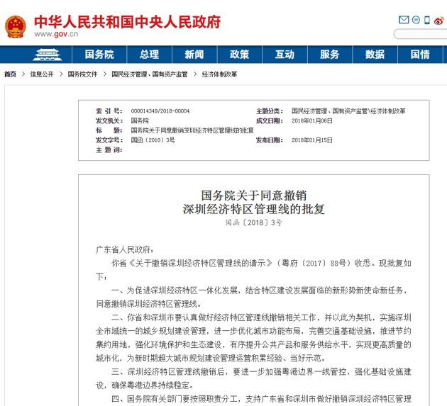 1月15日,记者从中国政府网获悉,为促进深圳经济特区一体化发展,结合特区建设发展面临的新形势新使命新任务,国务院发布《关于撤销深圳经济特区管理线的请示》的批复,同意撤销深圳经济特区管理线。