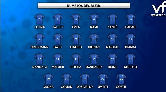 前锋:金斯利-科曼(拜仁慕尼黑)、吉尼亚克(墨西哥老虎)、吉鲁(阿森纳)、格列兹曼(马德里竞技)、马夏尔(曼联)、帕耶(西汉姆联)。