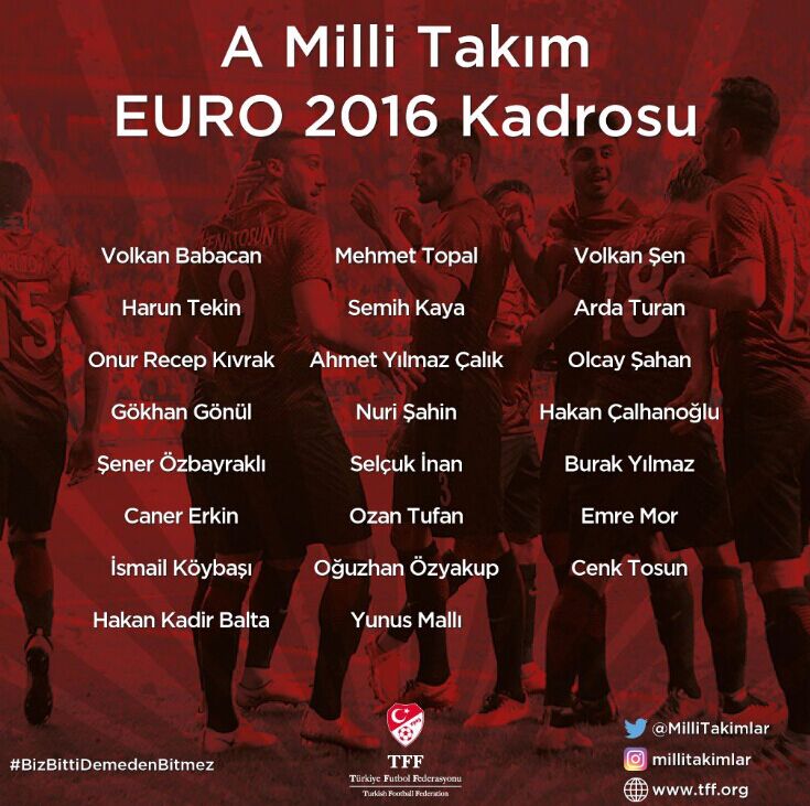 中场:莫尔(北西兰)、申(费内巴切)、恰尔汗奥卢(勒沃库森)、沙欣(多特蒙德)、厄兹亚库普(贝西克塔斯)、图凡(费内巴切)、伊南(加拉塔萨雷)、阿尔达-图兰(巴塞罗那)、沙汗(贝西克塔斯);