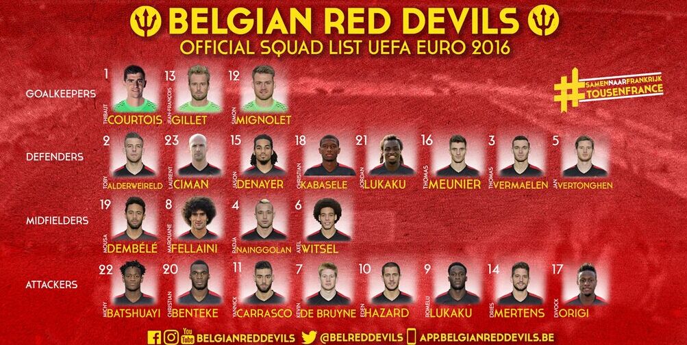 后卫:阿尔德韦雷尔德(热刺),希曼(蒙特利尔冲击),德纳耶尔(加拉塔萨雷),卡巴塞勒(亨克),小卢卡库(奥斯坦德),穆尼耶(布鲁日),维尔马伦(巴塞罗那),费尔通亨(热刺);