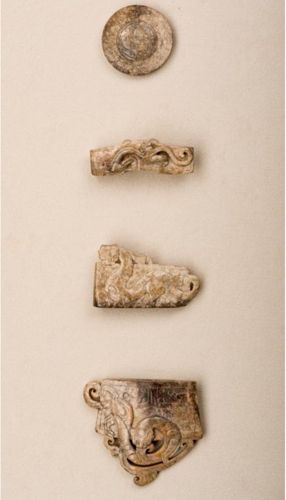玉具剑 西汉(公元前206—公元8年),1955年长沙市蓉园M13出土 湖南省博物馆藏由于汉代人比较重视佩剑,故玉剑饰在汉代极为流行,剑饰上多施螭虎纹、兽面纹和凤鸟纹等动物形纹饰,用以彰显汉代贵族雍容高贵之仪。此次展出的一套长沙市出土的玉剑饰,将多种刀法紧密结合,剑首阴刻云气纹,剑璏、剑格和剑珌分别高浮雕螭龙纹,其构思奇巧,神韵尽至,甚是精美。它是湖南地区目前发现唯一的一套完整的玉具剑,是汉代贵族尊贵身份的象征。