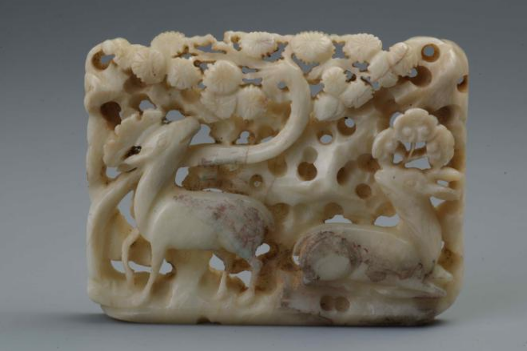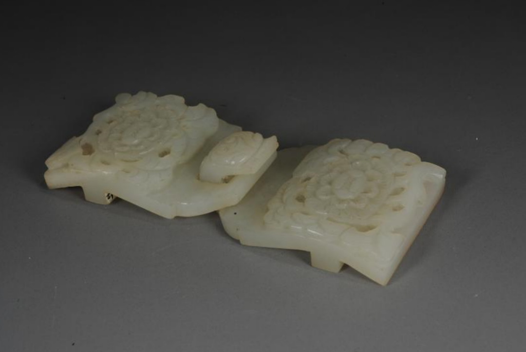 镂雕松下双鹿纹玉饰件 宋(公元960—公元1279年) 长沙市博物馆藏明清时期,随着帝王的喜爱、文人的推崇、玉路的畅通、产销市场的日益昌盛,玉器成为上至皇帝,下至平民随身佩戴、生活实用,无处不在的珍玩雅物。它集中华9000年玉文化之大成,代表了中国古代琢玉水平的最高成就,成为中国玉器发展的最高峰。明清玉器,讲究“图必有意,意必吉祥”,这一点在佩玉上体现得淋漓尽致。此次展出的一件明代折枝牡丹纹玉带扣,左右两片上各雕有一朵折枝牡丹花,大花大叶,疏密得体;加之玉质洁白,温润细腻,抛光好,工艺精,是明代玉作之精品。