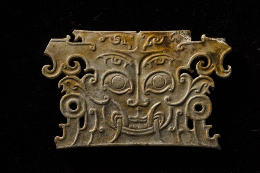 獠牙神像玉牌饰 新石器时代肖家屋脊文化(公元前2100—1700年),2018—2019年澧县孙家岗遗址M149出土 湖南省文物考古研究所藏孙家岗遗址出土的一件獠牙神像玉牌饰是本次展览中最有特点的玉器。它的两面纹饰完全相同,分别饰以头戴高冠獠牙外露的神人阴阳纹。其人面造型,五官皆备,惟巨目獠牙,狰狞凌厉,令人望而生畏,塑造出先民心中“神祖”的形象。以獠牙来表现神性,是我国史前艺术造型中普遍存在的现象。先民认为在人面造型中添加獠牙,既能赋人以神性,同时也使人升格为神,凸显部落首领的神秘与权威。夏代玉器在中国玉器发展史上具有承上启下的作用,展览中出土于偃师二里头夏都遗址的玉戚和玉钺脱胎于兵器,作为象征王权威严的仪仗用器,在当时受到统治阶层的高度重视。商代,伴随青铜工具的普遍使用,玉器很快走上一个新的台阶,开料、琢磨、钻孔、抛光等技术均已达到较高水平。至商代后期,中国玉器达到了自红山、良渚文化以来的第二个高峰,玉器品种之多、工艺之精、质料之佳可谓独树一帜,对后代玉器制作具有深远的影响。