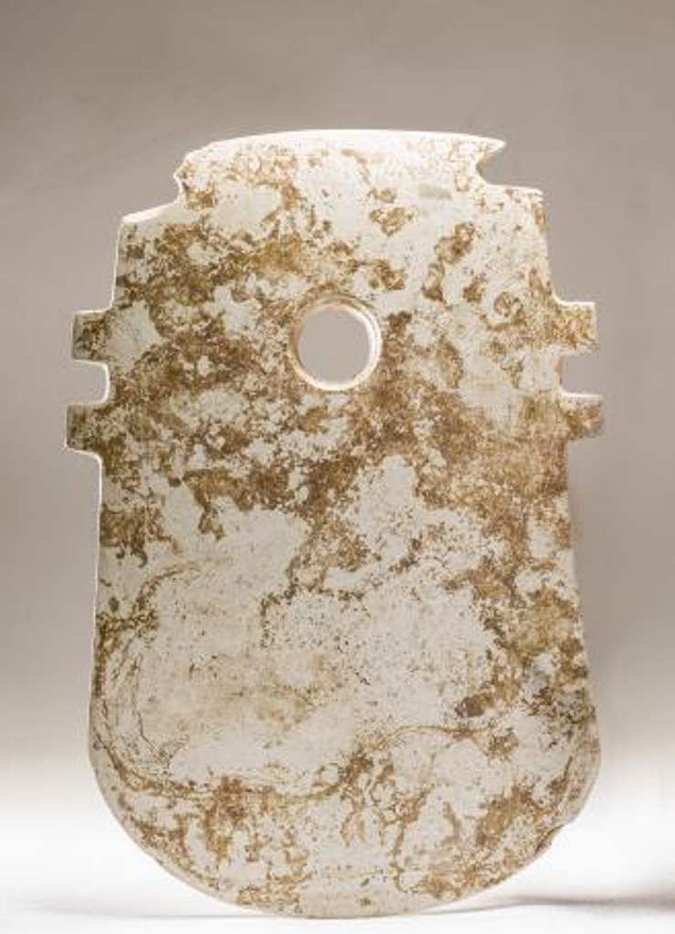 玉戚 新石器时代大溪文化(距今6500—5300年),2004—2005年洪江市高庙上层文化遗址M27出土 湖南省文物考古研究所藏根据考古学材料,我国最早的玉器出现在距今9000年、位于黑龙江省东北边陲双鸭山市饶河县的小南山遗址。到新石器时代晚期,在我国东部北自辽河流域,南到广东石峡文化广大的半月形沿海地区形成了中国玉器的第一个发展高峰。作为湖南地区新石器时代古遗址,孙家岗遗址主体文化堆积的时代在距今3800—4200年间,属于石家河文化早、中期遗存。当时在中原大地上,中国第一个王朝夏王朝正在孕育诞生,王气南渐,各类精美玉器流行。