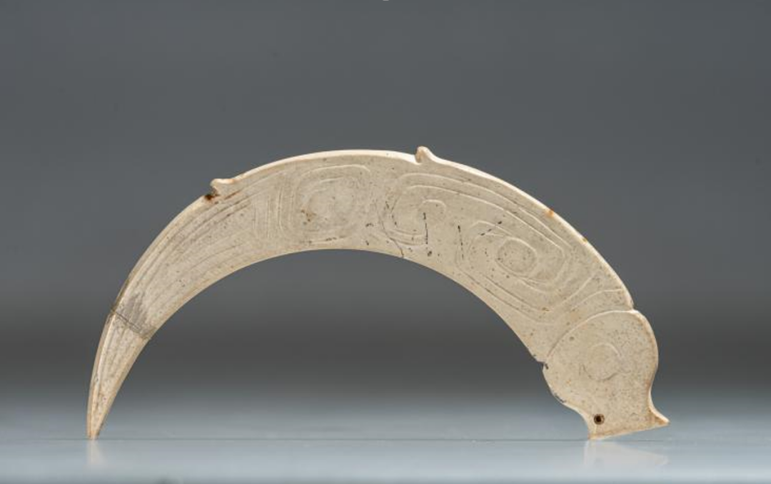 玉 鱼 商(公元前1600—前1046年),1973年宁乡县黄材三亩地出土 湖南省博物馆藏大量的玉雕动物和人像,多数采用了正侧面剪影的手法,突出玉雕对象的主要特征,运用准确的轮廓线,雕琢出生动的艺术形象来,这种手法与近代剪纸艺术的表现手法和风格相似。1973年宁乡县黄材三亩地出土的一件玉鱼,通体呈弧形,周身阴刻勾云纹、弧线纹等,线条流畅,形态逼真,极具商代玉器“剪纸式艺术”的典型特征,简洁而准确的造型充分反映了商代玉雕摹形与传神的高度统一。