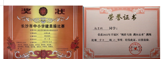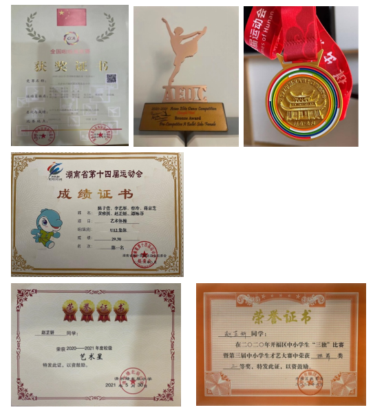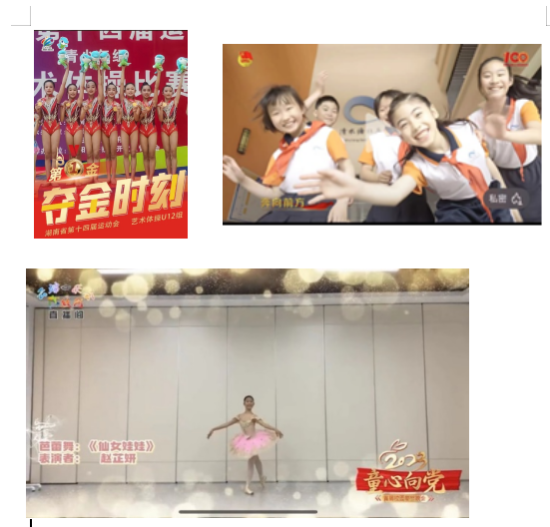 功夫不负有心人,2020年6月,我第一次参加开福区“三独”比赛就获得了独舞三等奖;并在同年又获得了“全国味啦操联赛长沙站”第二名和“长沙市中小学生健美操”比赛第一名的成绩;也被学校评为2020-2021年度“艺术之星”;2021年成都举办的亚州精英舞蹈大赛总决赛中我历经初赛、复赛一路过关斩将最终获得芭蕾独舞铜奖;刚刚过去的2022年是我幸运的一年,我不但顺利取得了北京舞蹈学院芭蕾舞捌级证书,又分别获得长沙市“三独”比赛独舞市二等奖和区一等奖;开福区跳绳比赛二等奖;开福区红领巾奖章“艺福章”;紧接着我又以选拔赛总分第一的成绩入选长沙市艺术体操代表队,代表长沙参加湖南省第十四届运动会并取得艺术体操团体金牌。我不会骄傲,因为现在取得地这一点点成绩少不了父母的支持和学校老师细心的教导。