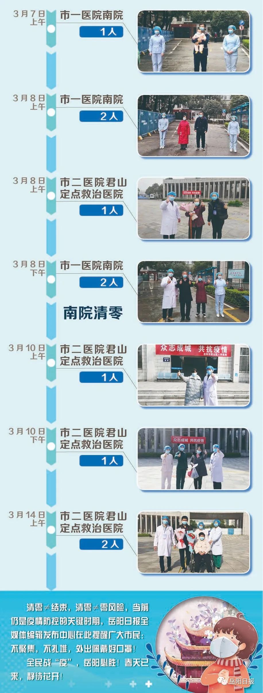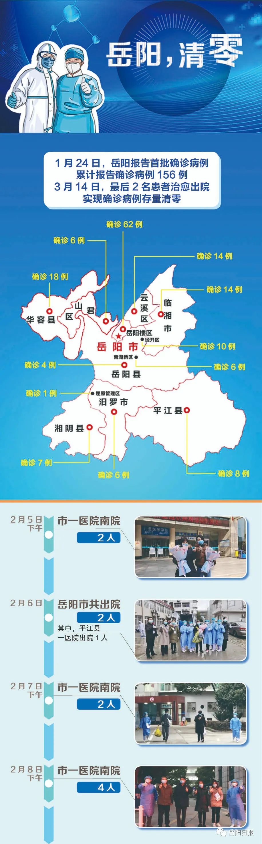 3月14日上午9点,岳阳市最后2名新冠肺炎确诊患者走出君山定点救治医院隔离病区,康复出院,意味着岳阳市已有的156例新冠肺炎确诊病例,155例治愈出院,1例死亡,实现存量清零。