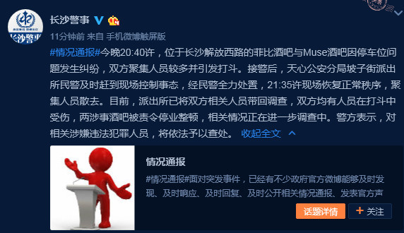 长沙晚报掌上长沙7月25日讯 据长沙警事微博消息:7月24日晚上20:40许,位于长沙解放西路的菲比酒吧与Muse酒吧因停车位问题发生纠纷,双方聚集人员较多并引发打斗。接警后,天心公安分局坡子街派出所民警及时赶到现场控制事态,经民警全力处置,21:35许现场恢复正常秩序,聚集人员散去。目前,派出所已将双方相关人员带回调查,双方均有人员在打斗中受伤,两涉事酒吧被责令停业整顿,相关情况正在进一步调查中。警方表示,对相关涉嫌违法犯罪人员,将依法予以查处。
