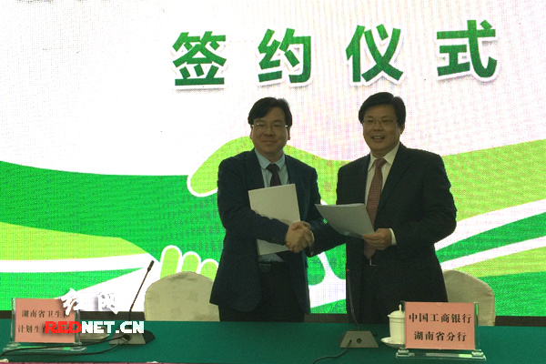 省卫生计生委主任张健(左)和中国工商银行湖南省分行代表签订《居民健康卡建设合作协议》