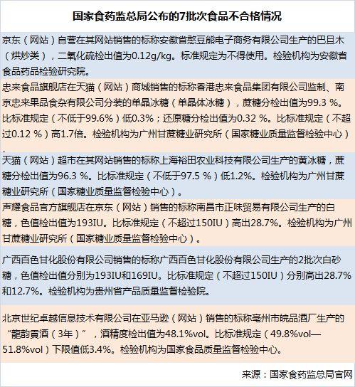 中新网1月3日电 据国家食品药品监督管理总局网站消息,食药监总局3日通告7批次食品不合格,京东、天猫等多个商家在售多款食品上榜。经营单位所在地食药监部门已要求有关单位立即采取下架等措施,控制风险,并依法予以查处。