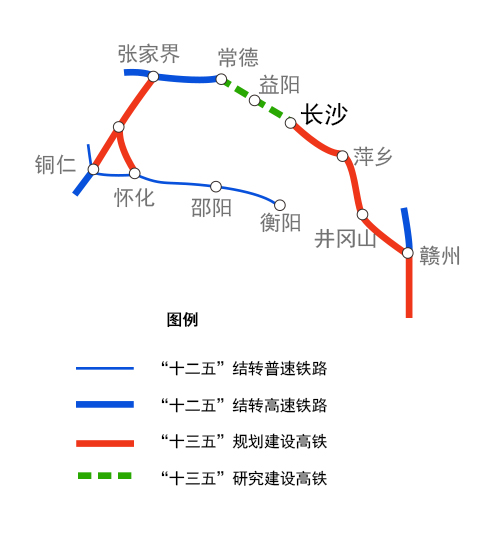 另外,作为厦渝高铁通道的一部分,长沙-益阳-常德高铁也出现的规划中。常张高铁、怀邵衡普速铁路将继续推进建设。