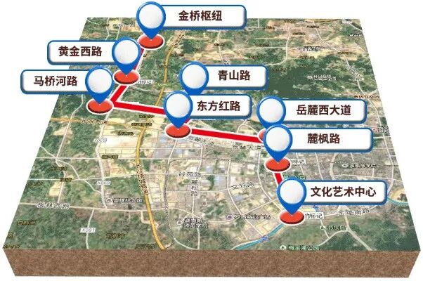 文化艺术中心-麓枫路-岳麓西大道-东方红路-青山路-马桥河路-黄金西路-金桥枢纽,线路长度14千米。分两期建设,一期从文化艺术中心至岳麓西大道,今年12月份启动建设;二期从岳麓西大道至金桥枢纽(具体建设内容以最终审定的方案为准)。