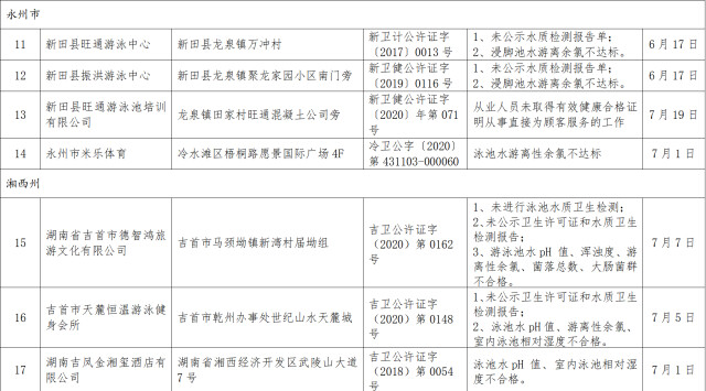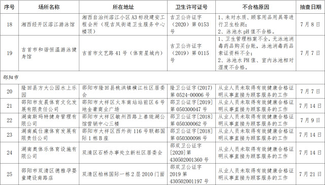 长沙晚报掌上长沙7月27日讯 据湖南日报消息 记者今天从湖南省卫生计生综合监督局获悉,按照国家卫生健康委有关通知精神,湖南各级卫生健康综合监督执法机构近日在全省范围内开展了游泳场所卫生国家随机监督抽查工作,监督抽查的内容重点为游泳场所经营者落实9项卫生管理制度情况和游泳池及浸脚池水质7项指标达标情况。根据随机监督抽查结果,省卫生计生综合监督局向社会公布了第一批29家卫生监督抽查不合格游泳场所名单。