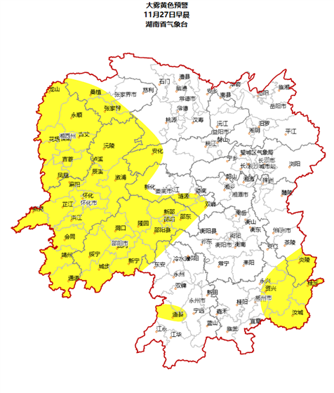 湖南省气象台11月26日16时发布大雾黄色预警: