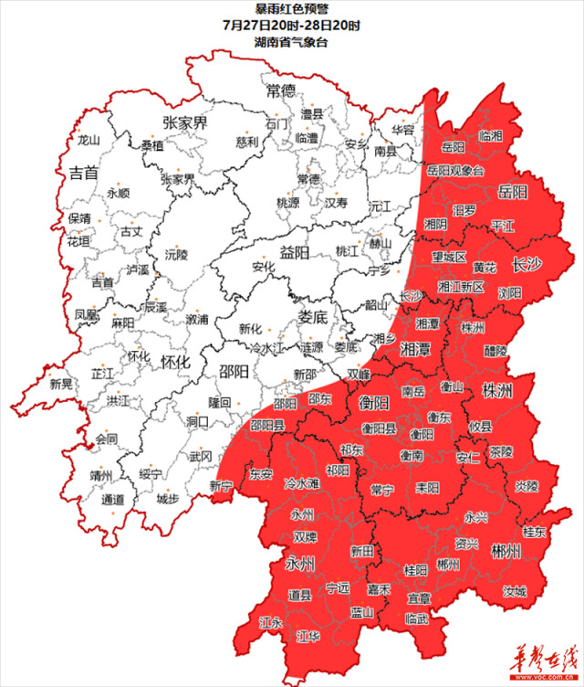 湖南省气象台7月27日16时发布暴雨红色预警:预计27日20时至28日20时,长沙、株洲、湘潭、衡阳、邵阳东部、岳阳、郴州、永州将出现暴雨,部分地区大暴雨,局地特大暴雨,并伴有短时强降水、雷雨大风等强对流天气,请加强防范。