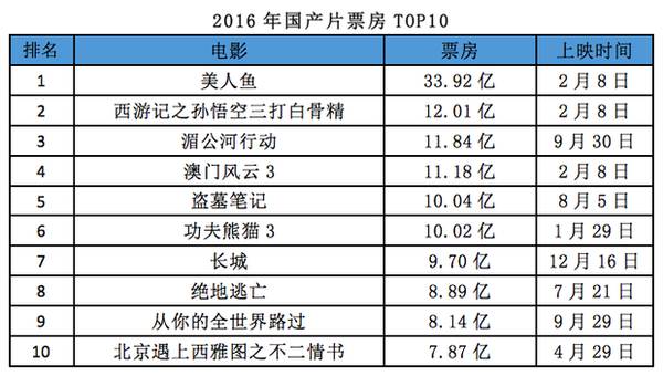2016内地票房最终定格457亿 《美人鱼》夺冠