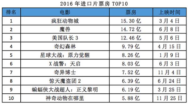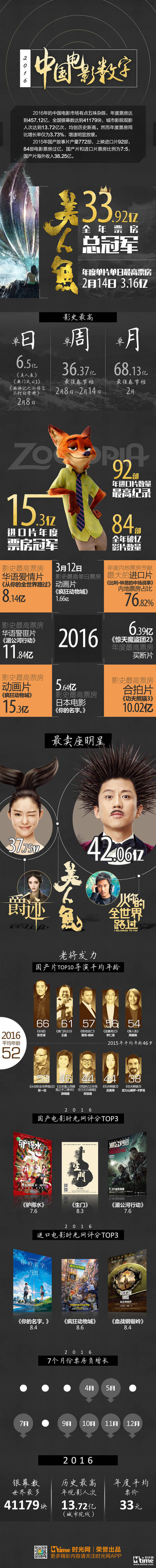 虽然12月上中旬在《你的名字》、《长城》等片的带动下,内地票房一度表现抢眼,但后半程渐露疲态,相较去年同期42亿成绩,今年12月票房最终仍出现了负增长——31天报收约40.7亿,下跌3%。最终,2016年票房下跌的月份达到了7个:4月、5月、7月、9月、10月、11月、12月。 今年国产片票房冠军和进口片票房冠军分别被《美人鱼》和《疯狂动物城》夺得,两部电影也分别打破内地影史单片票房纪录和内地影史动画片票房纪录。对于国产电影,中国观众还是喜欢“喜剧+特效”的搭配。对于动画电影,中国观众的接受度则明显提升,令人欣喜。此外,华语爱情片、华语警匪片、合拍片、日本电影等多个电影类型也都在今年刷新了单片票房纪录。 过去一年中,共有9部电影内地票房突破10亿,其中国产电影(含合拍片)6部,相比进口片优势明显。不过,今年进口片在数量上破了纪录,达到92部之多,总票房190.49亿,内地年度票房占比41.67%。全年内地票房过亿影片84部,比去年多出3部。 不管是统计票房,还是统计观影人次、银幕数,2016年的内地影市都达到了历年峰值。只不过增速上的“急刹车”令人有些措手不及。可以确定的是,内地影市依然潜力巨大,希望在不久的将来能有一个好的调整。祝2017年的中国电影市场好运!
