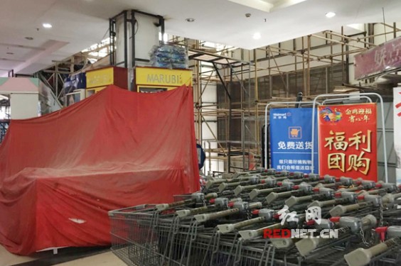 店外处于装修状态,仅一个出入口供顾客进出超市。