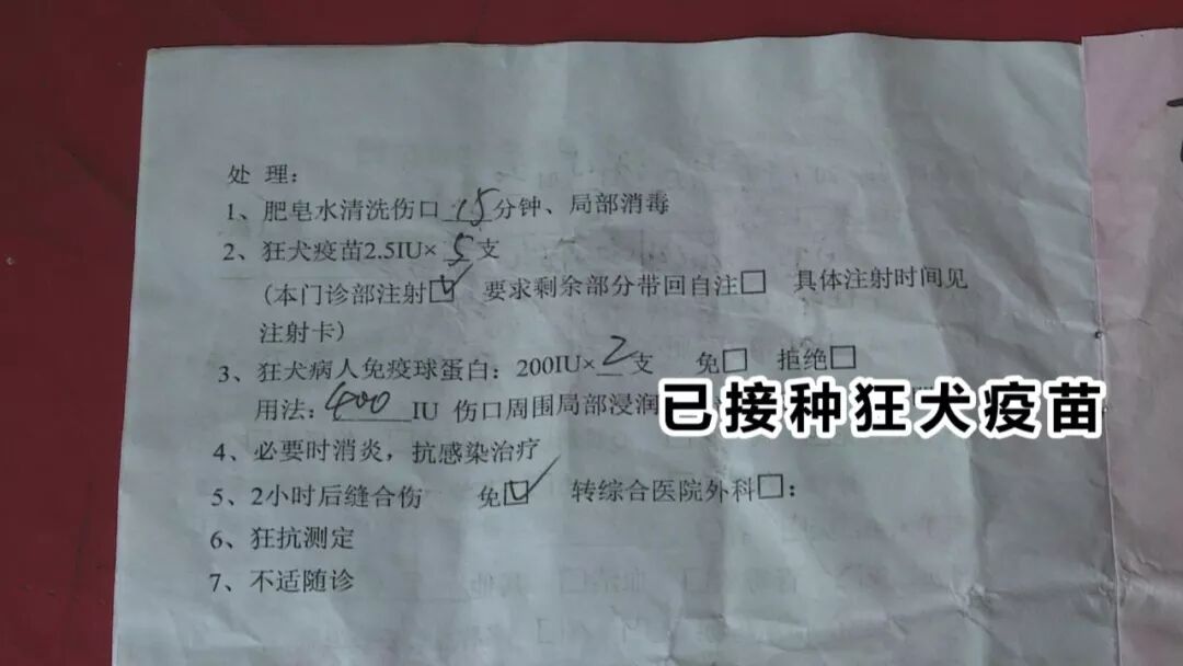 周医生:伤得比较深,属于三度以上伤口了。我们乡镇卫生院就不能处理三度以上的伤口,因为没有这个条件,然后我就立即转诊了。转诊到上级医疗机构处理,然后那个小孩在我们这里待的时间也就一分钟左右,狗主人立即带小孩走了。