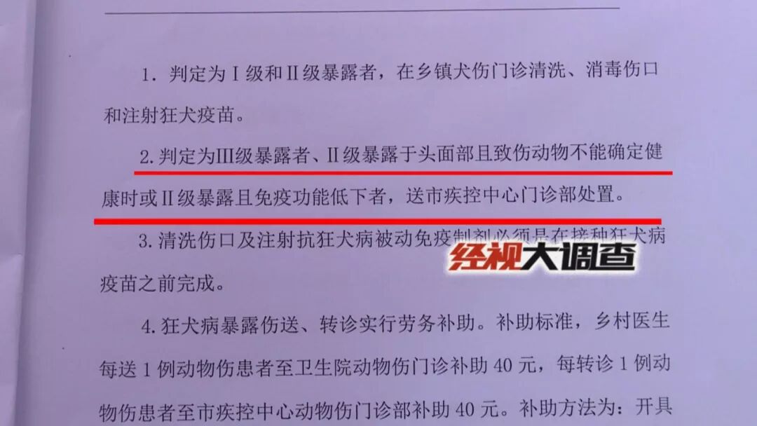 从节目中暴露出乡镇一级卫生院,甚至市级疾控中心仍然存在条件不够的问题,对被狗咬伤患者不能及时处置与应对,甚至连清洗创口都无法进行,着实令人遗憾。我们呼吁要管控好家中的养狗,尤其是农村地区。除了管好狗防止伤人以外,还要给狗注射疫苗。另外一旦被狗咬伤,可以自己立即用肥皂水清洗创口15分钟以上,再迅速注射血清与疫苗。