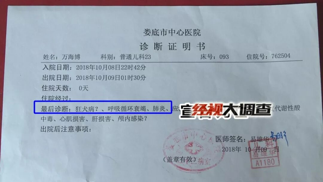然而不幸的事还是发生了,就在10月8号22点49分,万海博出现呼吸停止的情况,经抢救后,于10月9日凌晨1点半宣告死亡,而得出的结论是狂犬病。10月29日,湖南省疾病预防控制中心出具的检验报告显示,结果呈阳性,疑似狂犬病。