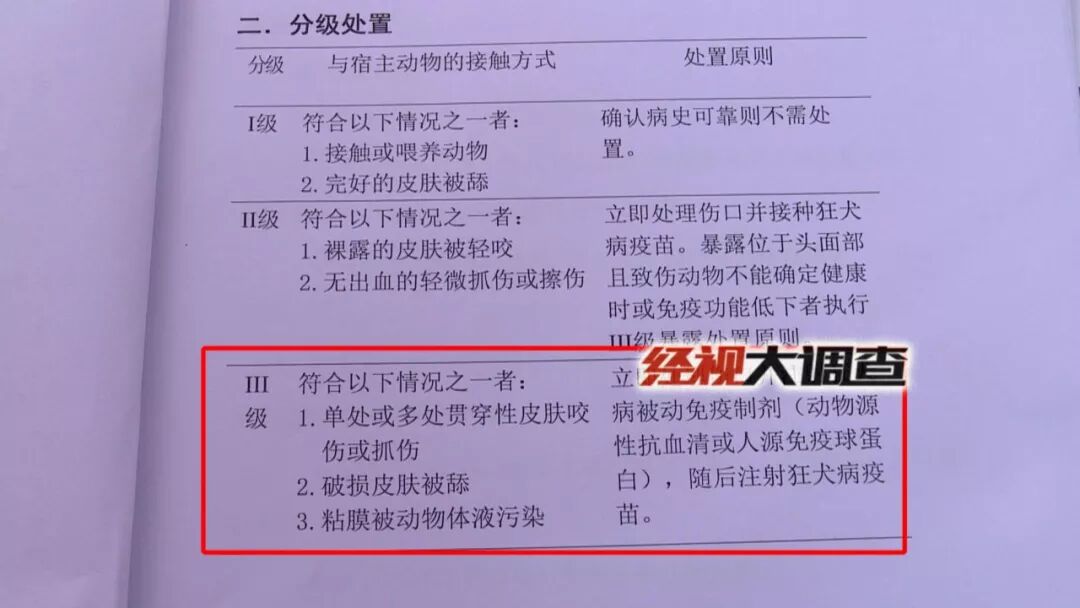 在湘乡市毛田卫生院办公室,副院长谢文华出具了一份湘乡市疾控2011年下发的通知,上面写着判定为三级暴露者,送市疾控中心门诊部处置。他说:这个医生当时的处理是按我们对狂犬疫苗的伤口的处理有一个原则,她是坚持第三级别的伤口,我们还是不能处理。我们乡镇卫生院能处理的就是一二级的伤口,为了争取时间,你尽快去大医院去给他清洗伤口,必须由专业的机构专业的清洗。
