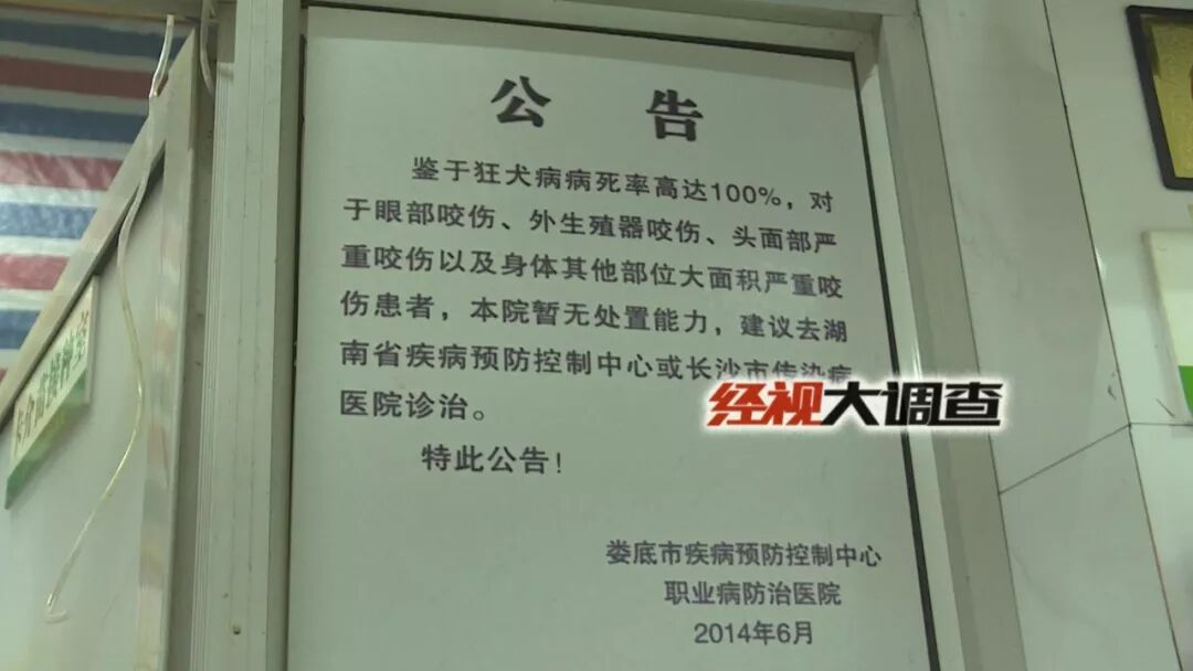 娄底市疾控中心还张贴着一个公告,称鉴于狂犬病病死率高达100%,对于头面部严重咬伤等,本院暂无处置能力,建议去湖南省疾病预防控制中心或长沙市传染病医院诊治,公告时间是2014年6月。