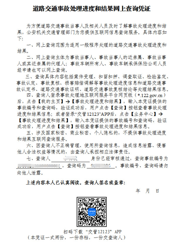 查询主体可以通过登录 “交管12123”APP或者互联网平台网页版(*.122.gov.cn),输入查询凭证提供的事故编号和查询码进行查询。