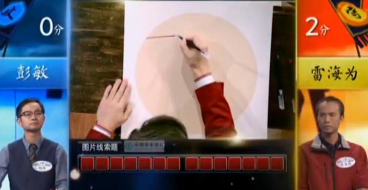 第二道题,彭敏再次抢答。这个答案让在场的老师们目瞪口呆。因为董卿的问题是两句宋词,而彭敏说出的却是两句宋诗。此时,雷海为2:0领先。第三道题,两人都没有急于回答,因为图画中关键的线索并没出现,等待的过程中,雷海为首先按下了抢答器。
