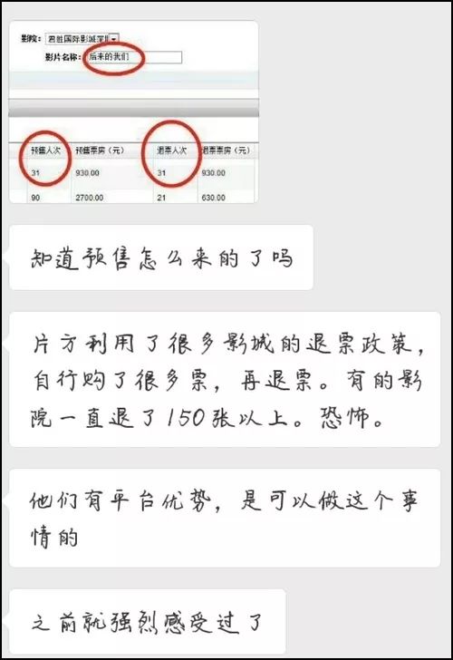 微博知名电影博主“电影票房”贴出影院工作群聊天记录,质疑该片为抢排片而做出不正当操作,即自己大面积购入预售票,以预售票房数据架住院线排片后,再于上映当日大批退票。