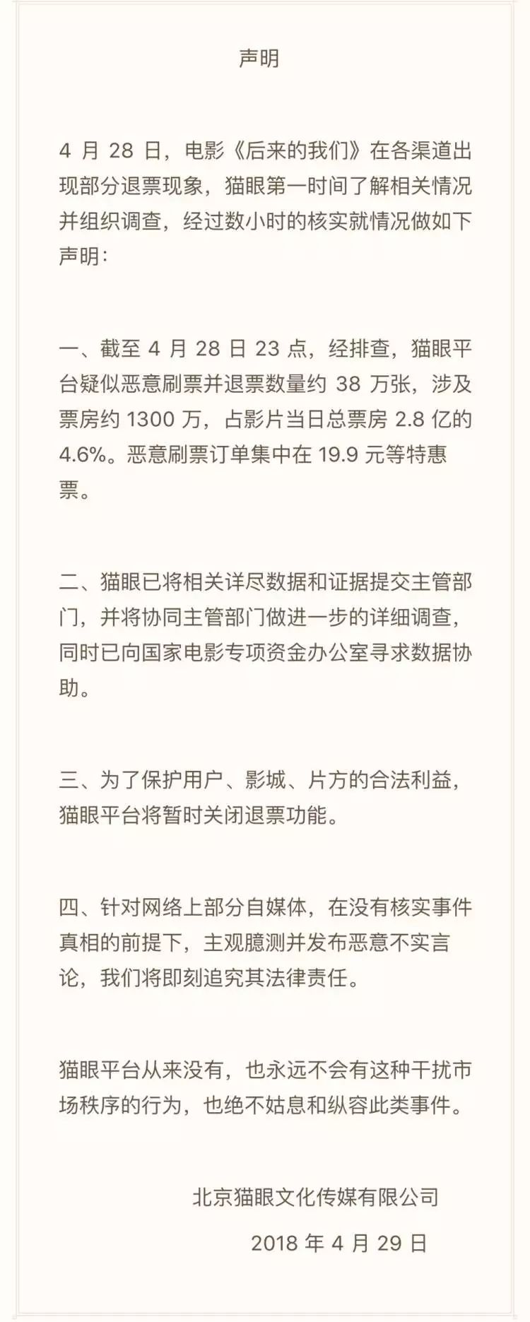 对于此次“退票事件”,猫眼电影29日凌晨作出声明,表示已将相关数据、证据提交主管部门并将协同作进一步的详细调查,同时平台将关闭退票功能。