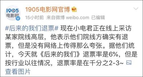 @1905电影网官博也采访了某家院线高层,对方表示,他们院线方确实有退票,但是没有网络上传得那么夸张,据他们统计,28日就《后来的我们》退票率是6%,但是按照行业以往的情况,退票率是在千分之2-3。