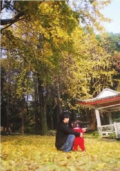 烈士公园潇湘奇石馆内有一大片金灿灿的银杏林,约有二三十棵,大部分树的高度都超过了20米,挂满了金灿灿的叶子。这里的银杏年龄超过了50岁,是长沙城区树龄最大的一片银杏林。