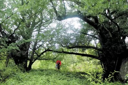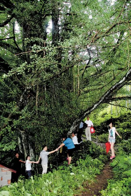 这3株古树枝繁叶茂,根粗杆壮。特别是其中两株,一雄一雌,相距约20米,但它们的树枝竟在空中连接在一起,宛如夫妻手拉手的模样。