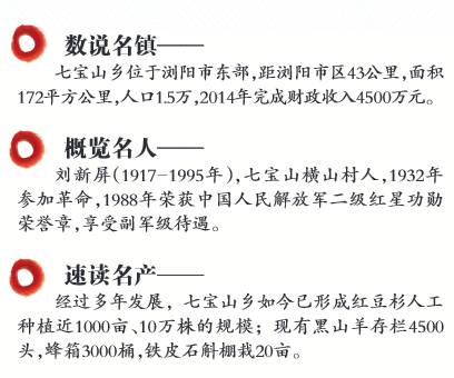 七宝山乡位于浏阳市东部,因历史上盛产铅、铁、硼砂、青矾、胆矾、土磺、碱石等“七宝”而得名。境内土地肥沃,主要以种植水稻、中药材、花卉为主,资源丰富,拥有森林面积11976.9公顷,是浏阳市松、杉、杂木、楠竹的重点产区之一:拥有丰富的地下矿藏,盛产铅、锌、铜、硫、金、银等矿,锗、镓、锑等稀有金属和优质高岭土亦有相当储量。